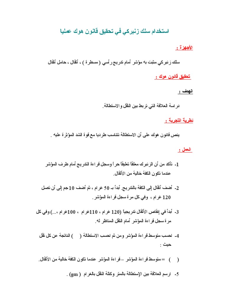 مجموعة من الأثقال المعروف وزنها. سبرنك مثبت به مؤشر أمام تدريج رأسي أثقال حامل أثقال ساعة إيقاف. المواد التي ينطبق عليها قانون هوك تقريب ا هي مواد خطية المرونة. دراسة العلاقة التي تربط بين الثقل والاستطالة.